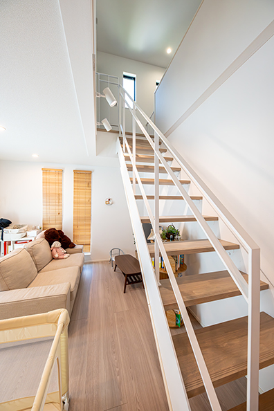 スケルトン階段×吹き抜けが演出する開放的な空間。