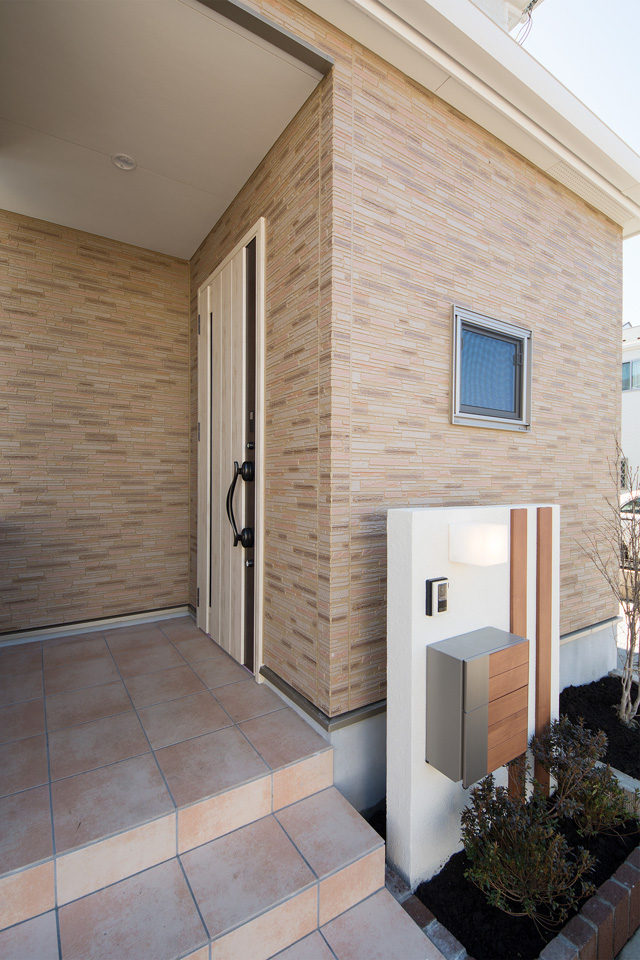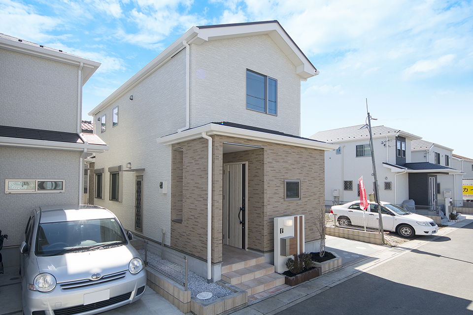 白を基調とした外観。ブラウンのアクセントがナチュラルな雰囲気をプラス。 あたたかみを感じるファサードデザインに仕上がりました。