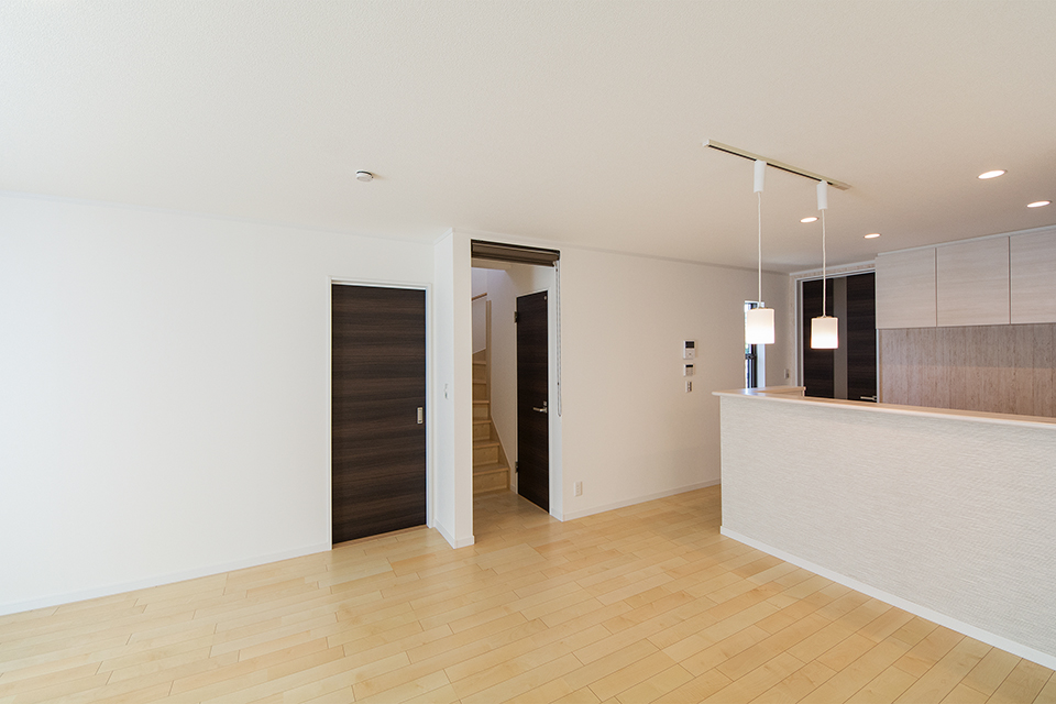 シンプルモダン埼玉県狭山市30坪以上玄関土間、リビングイン階段、ハイスタッド、アイランド/ペニンシュラキッチン