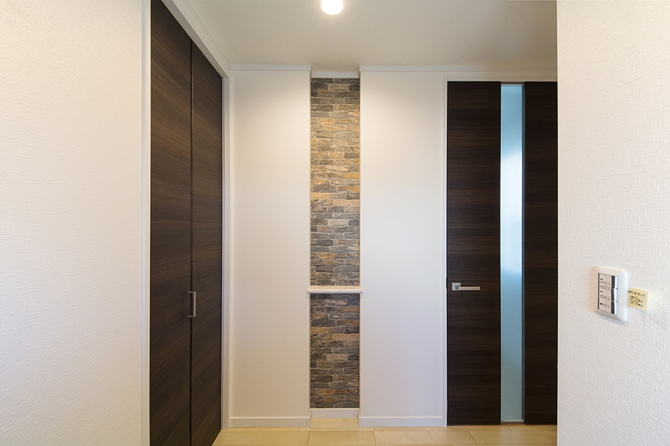 玄関正面に設えたニッチ棚。石目調のアクセントクロスが落ち着いた雰囲気を演出。