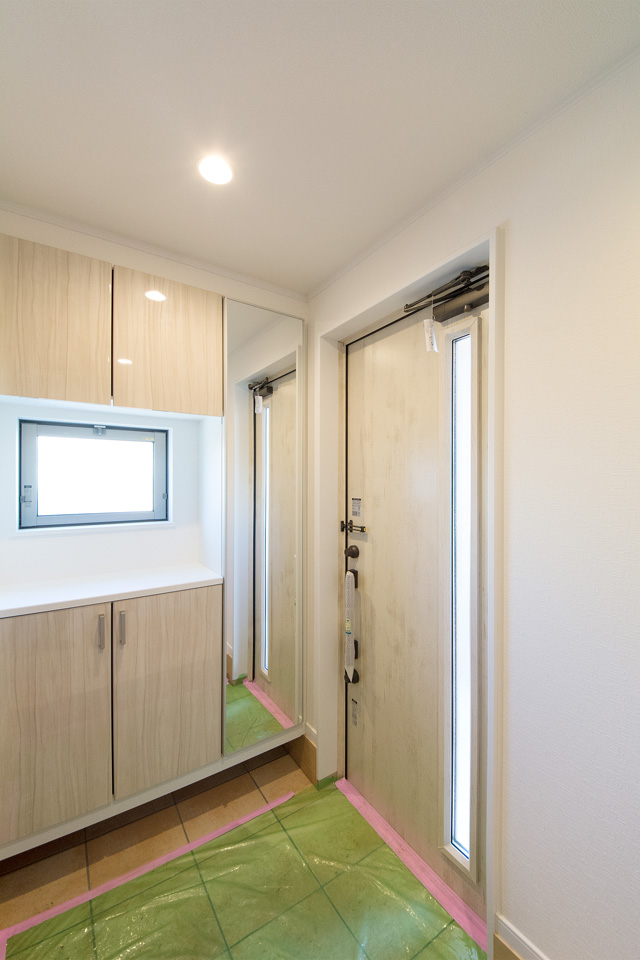 ドアとキャビネット背面から採光し、明るい玄関空間に。