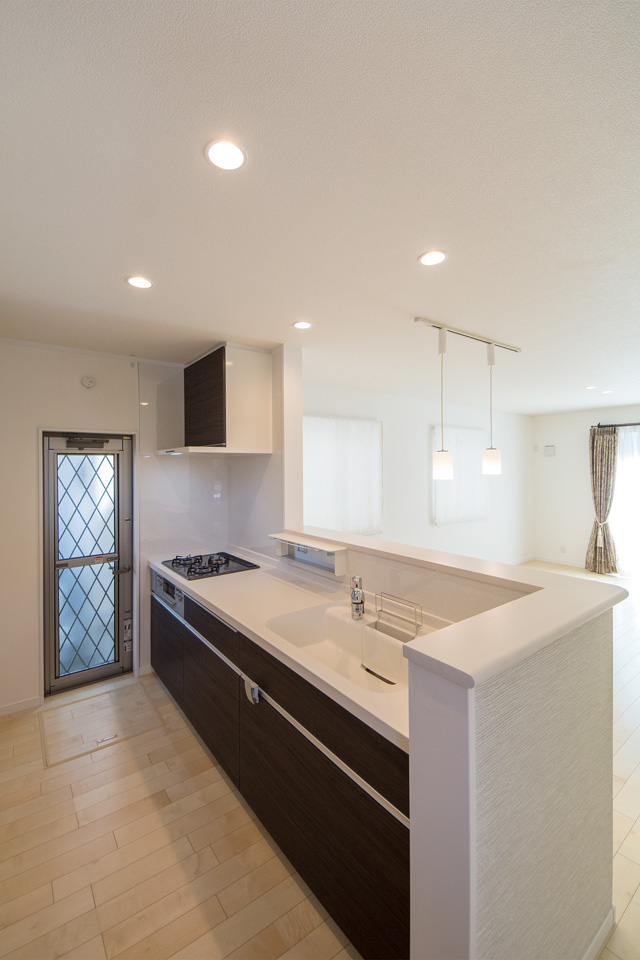 ダークブラウンのキッチン扉。建具の色に合わせて統一感のある空間に。