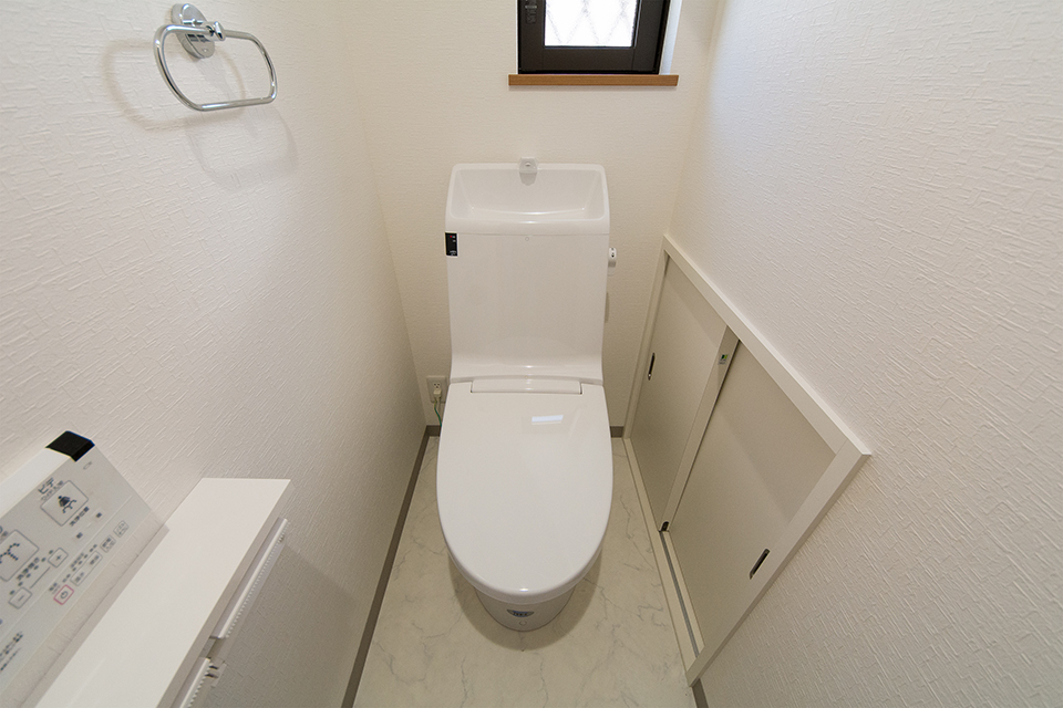 白を基調とした清潔感のある1階トイレ。 階段下のスペースを収納に。