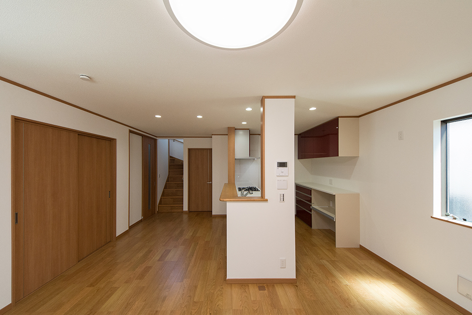 シンプルモダン埼玉県狭山市30坪以上玄関土間、リビングイン階段、ハイスタッド、アイランド/ペニンシュラキッチン