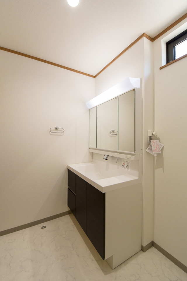 白を基調とした清潔感のあるサニタリールーム。ダークのブラウンの洗面化粧台が印象的。
