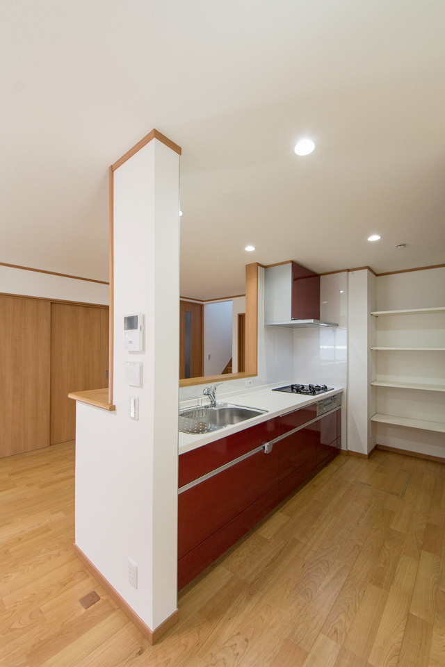 ディープレッドのキッチン扉がスペースを彩ります。奥には収納に便利なパントリーを設えました。