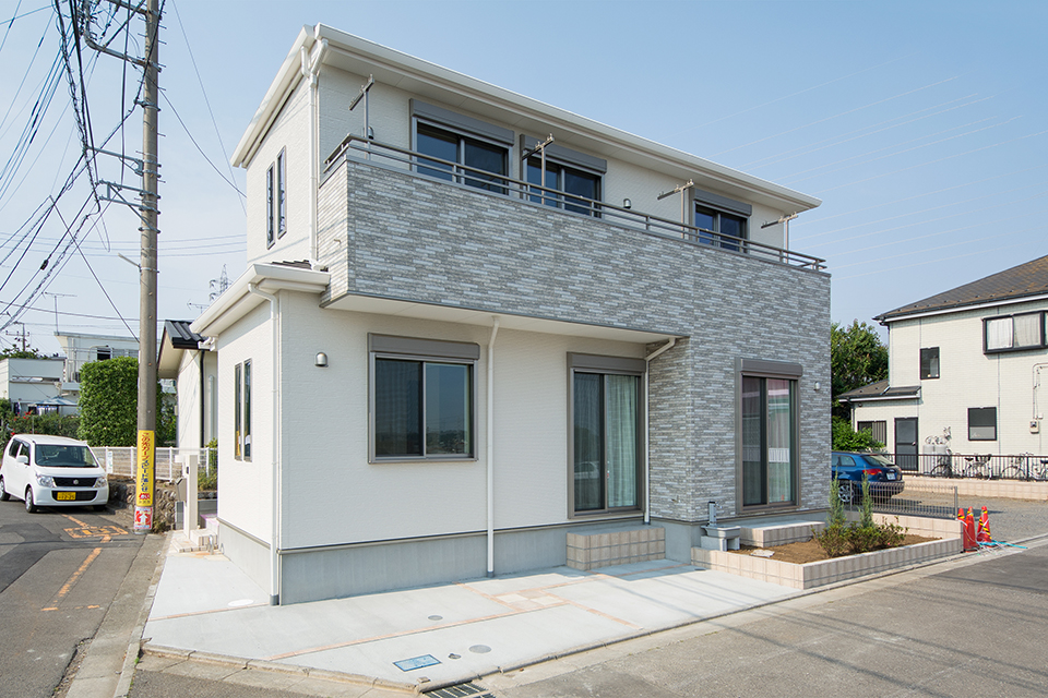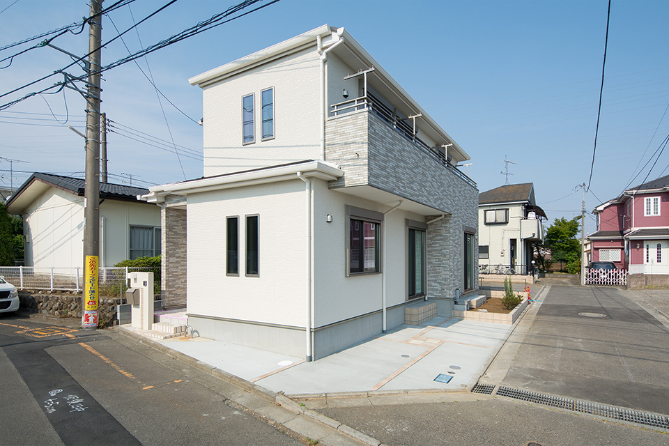 白の石積み調サイディングをベースに、グレーの窯変調サイディングをアクセントにあしらった外観。落ち着きのある雰囲気に仕上がりました。