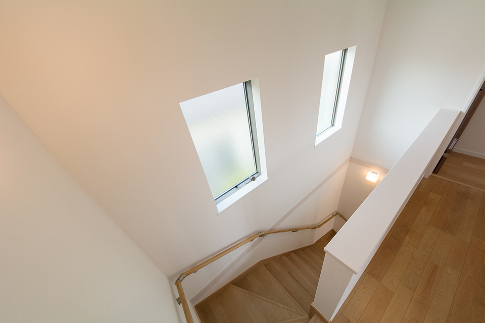 大きな窓をしつらえた、明るく開放感のある階段。