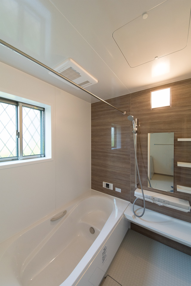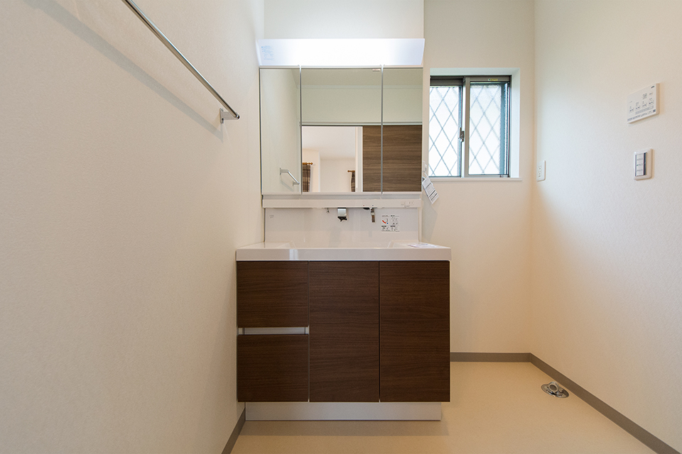 白を基調とした清潔感のあるサニタリールーム。ブラウンの洗面化粧台がナチュラルな雰囲気を演出。