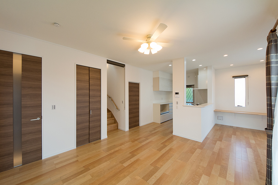 穏やかな木目と緻密な木肌が印象的なバーチのフローリングがブラウンの建具と相まって、ナチュラルな空間を演出。