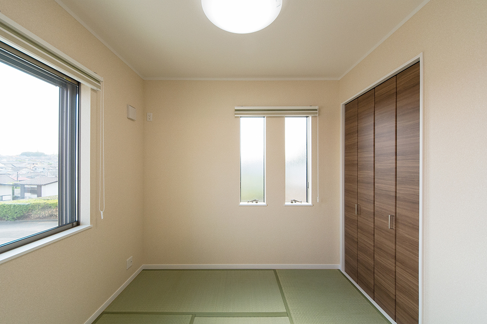 畳のさわやかなグリーンが心地良い空間。2連の縦窓が端正な表情を演出。