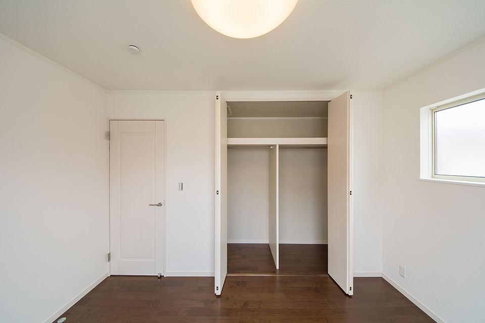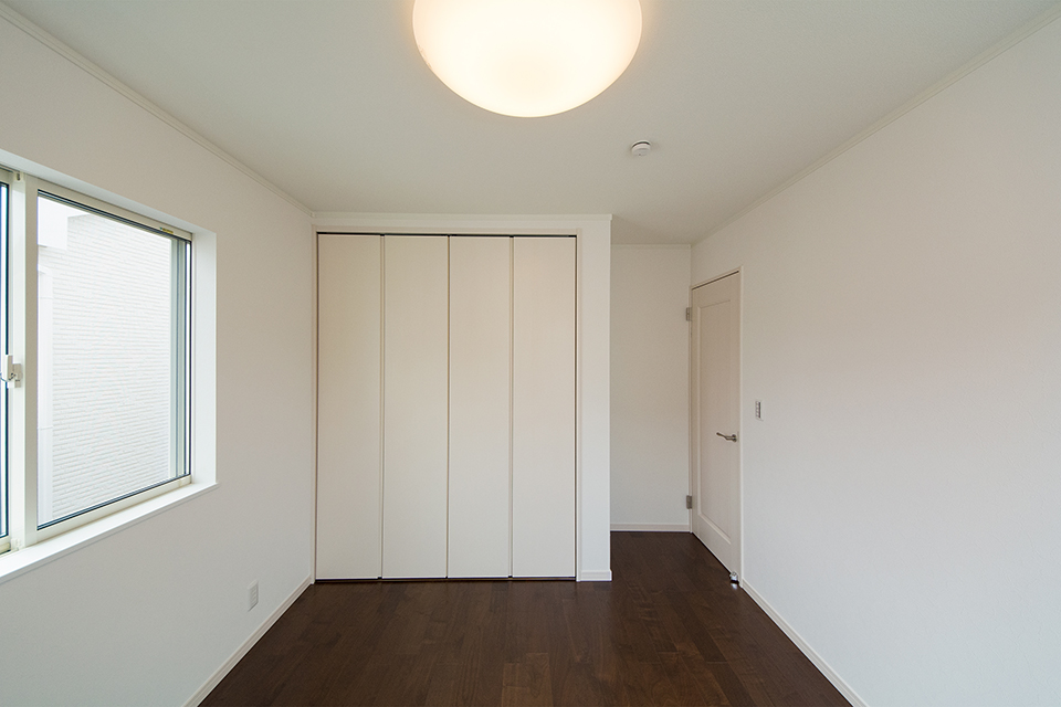 2階洋室もリビング同様の配色。ブラックウォルナットのフローリングに白のクロスと建具がメリハリのある空間を演出。