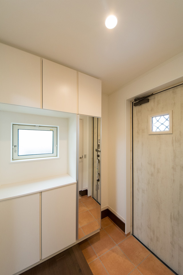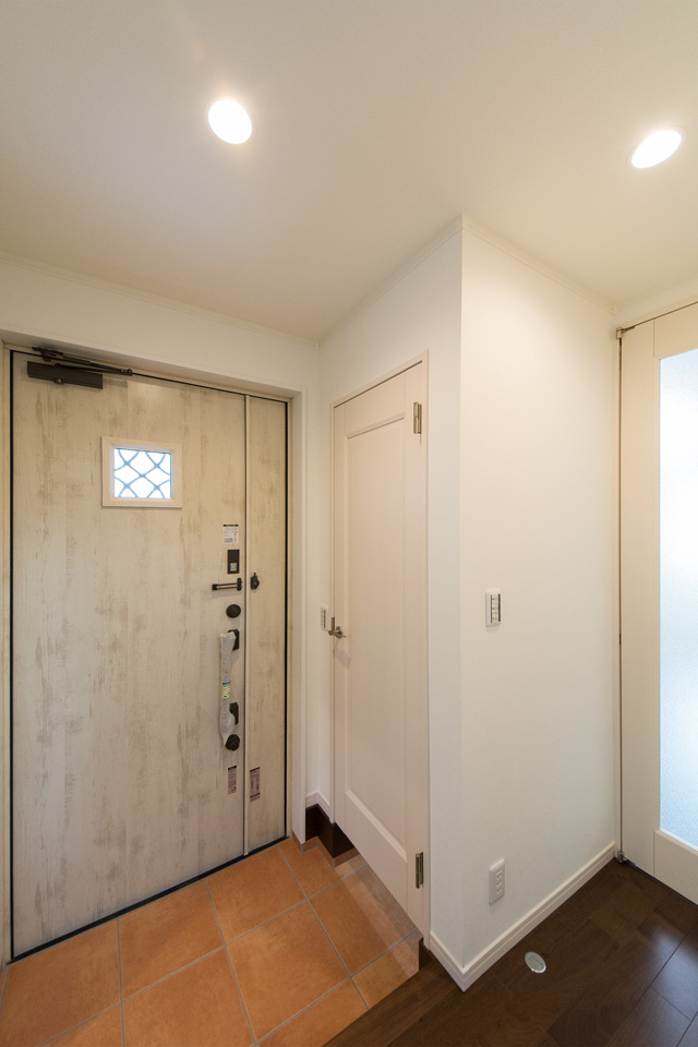 ナチュラルな雰囲気を演出するエクリュアイボリーの玄関ドアと赤のテラコッタ調タイル。
