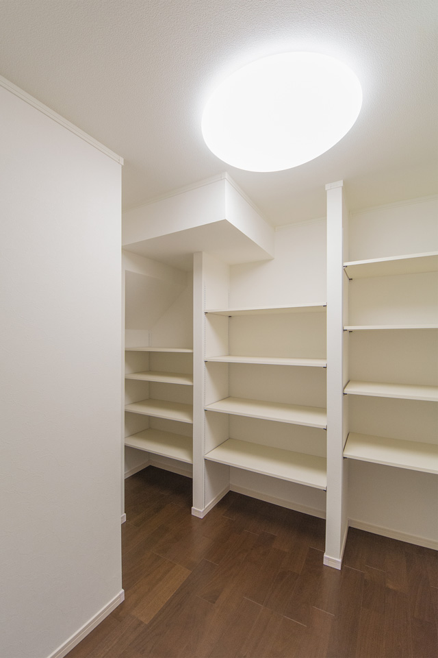 1階家族共有のファミリークローゼット。廊下とリビングの両方から出入りが出来てとても便利。