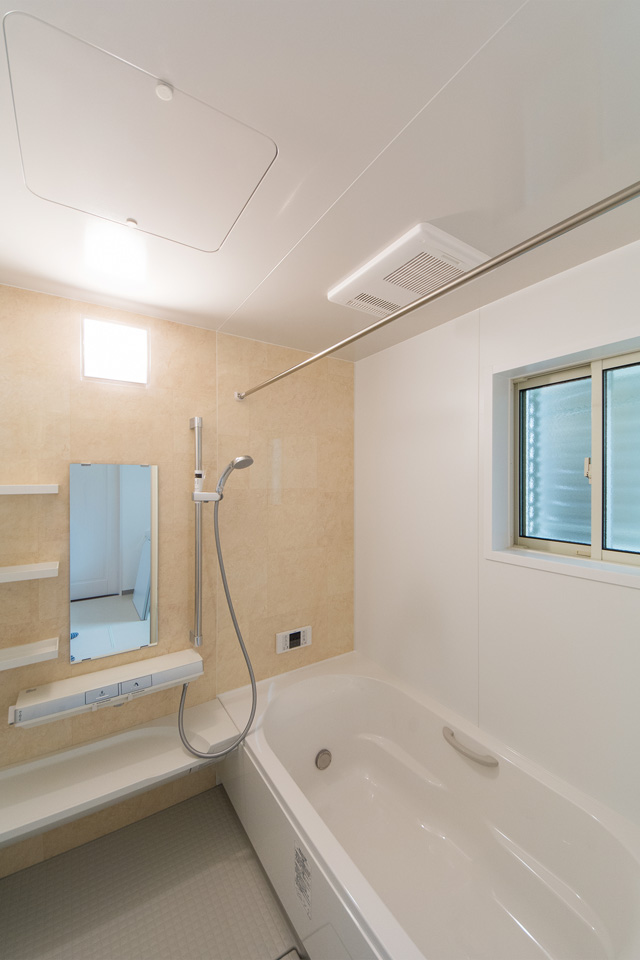 ベージュ系のアクセントパネルを使用した穏やかな印象のバスルーム。