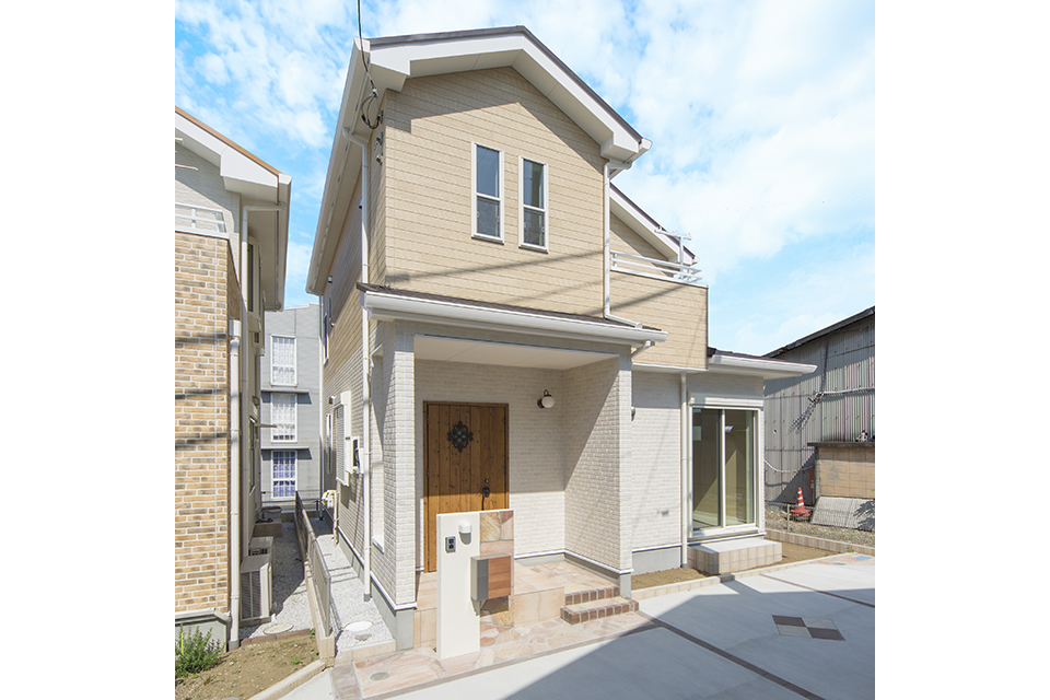 白いブリック調サイディングと、明るいウッド調サイディングを張り分けた、温かみのあるナチュラル&モダンテイスト。