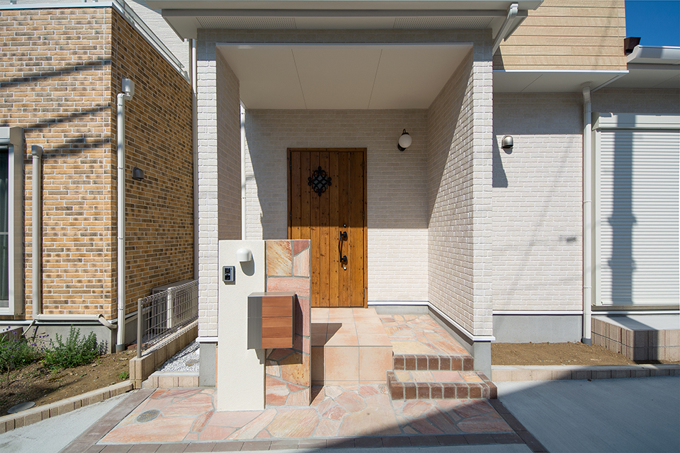 アイリッシュパインの玄関ドアと、ベージュのテラコッタ調タイルがナチュラルな雰囲気を演出。