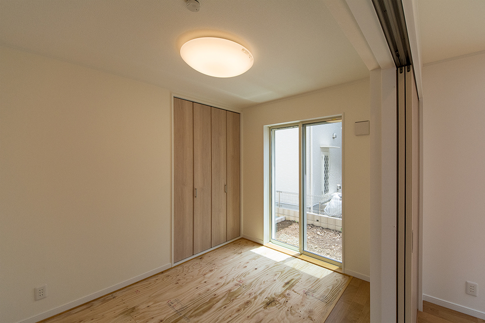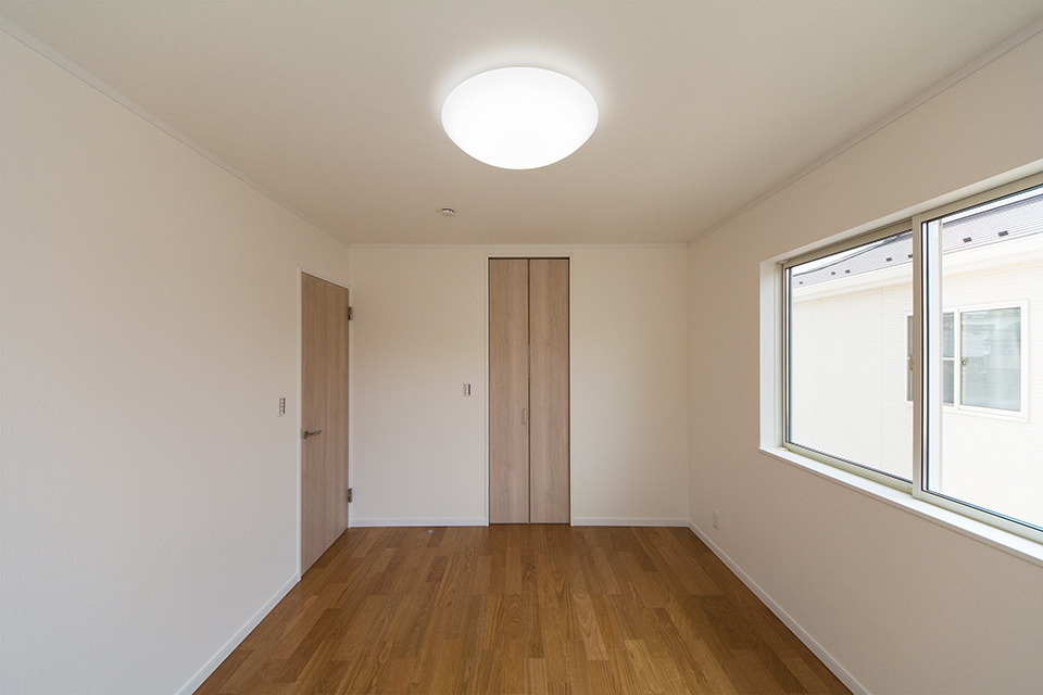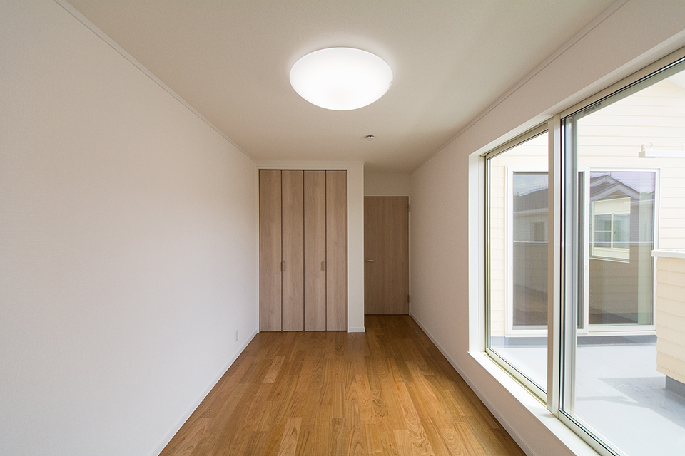 2階洋室。リビング同様ブラックチェリーのフローリングとオークの建具がナチュラルな空間を演出。