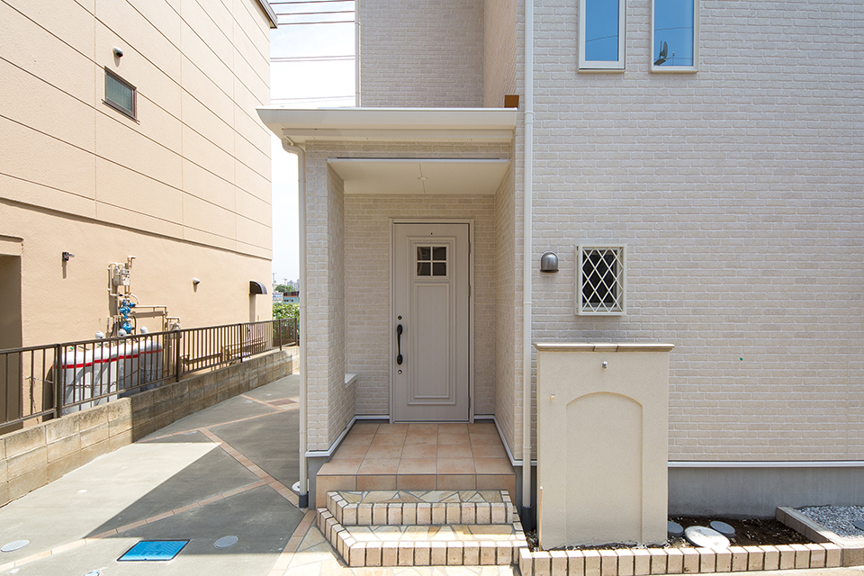 温かみのある白のブリック調サイディングを全面に使用したナチュラルなデザイン。 ベージュのテラコッタ調タイルがファサード全体のアクセントに。