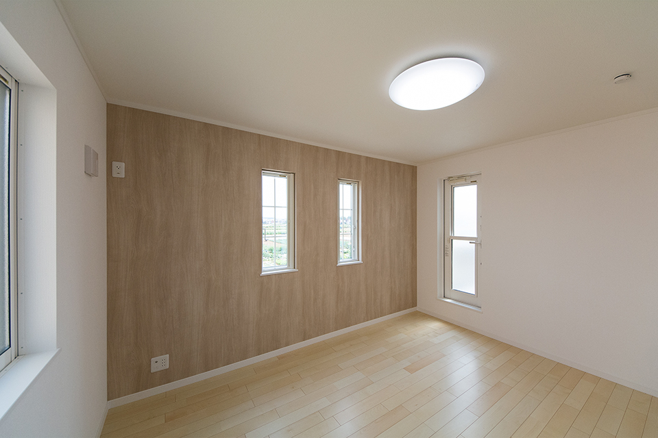 ウッド調のナチュラルなアクセントクロスをあしらった2階主寝室。