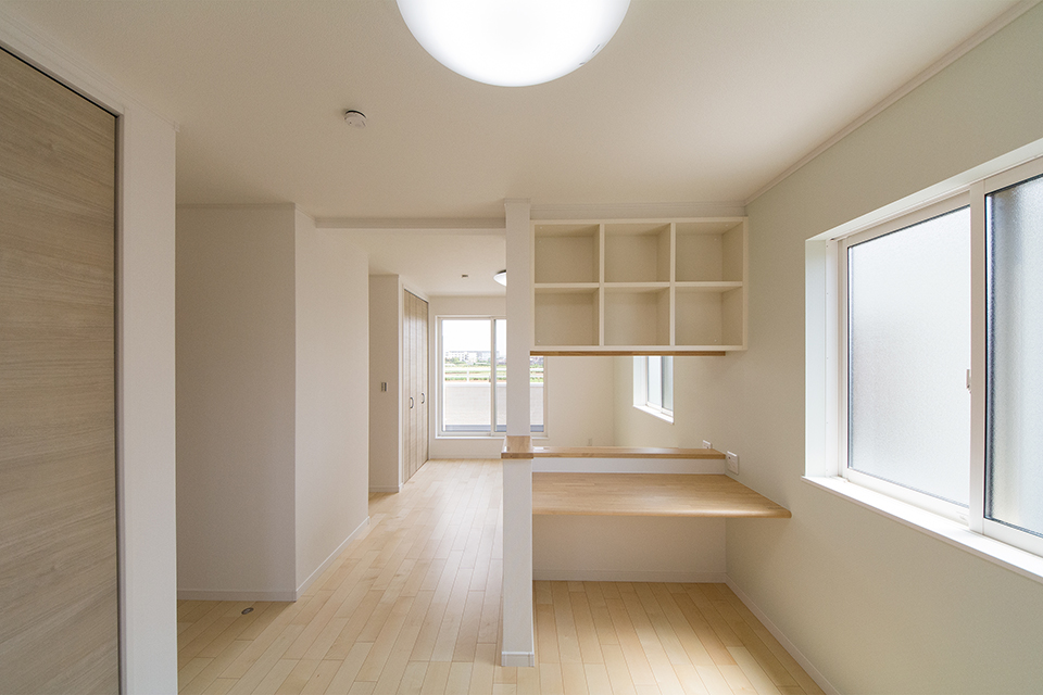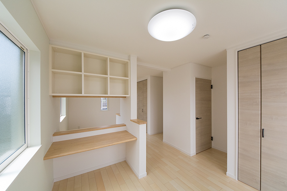 お子様の成長に合わせて、2部屋に出来る2ドア1ルームの2階洋室。本棚付きスタディカウンターをしつらえました。
