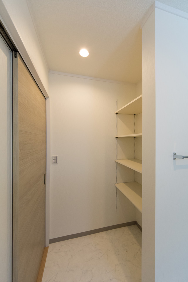 タオルや洗剤等をたっぷり収納できるリネン棚を設置したサニタリールーム。