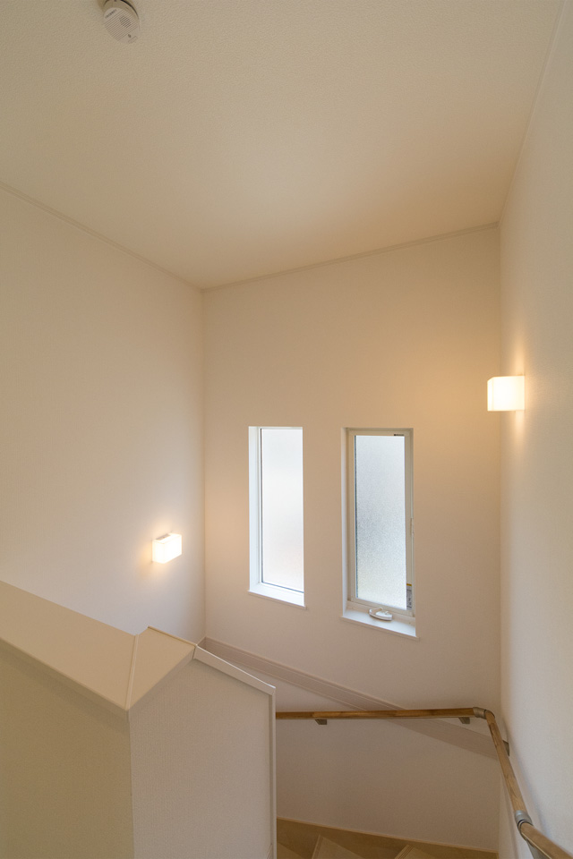 大きな窓をしつらえた、明るく開放感のある階段。