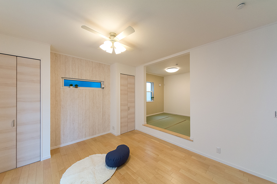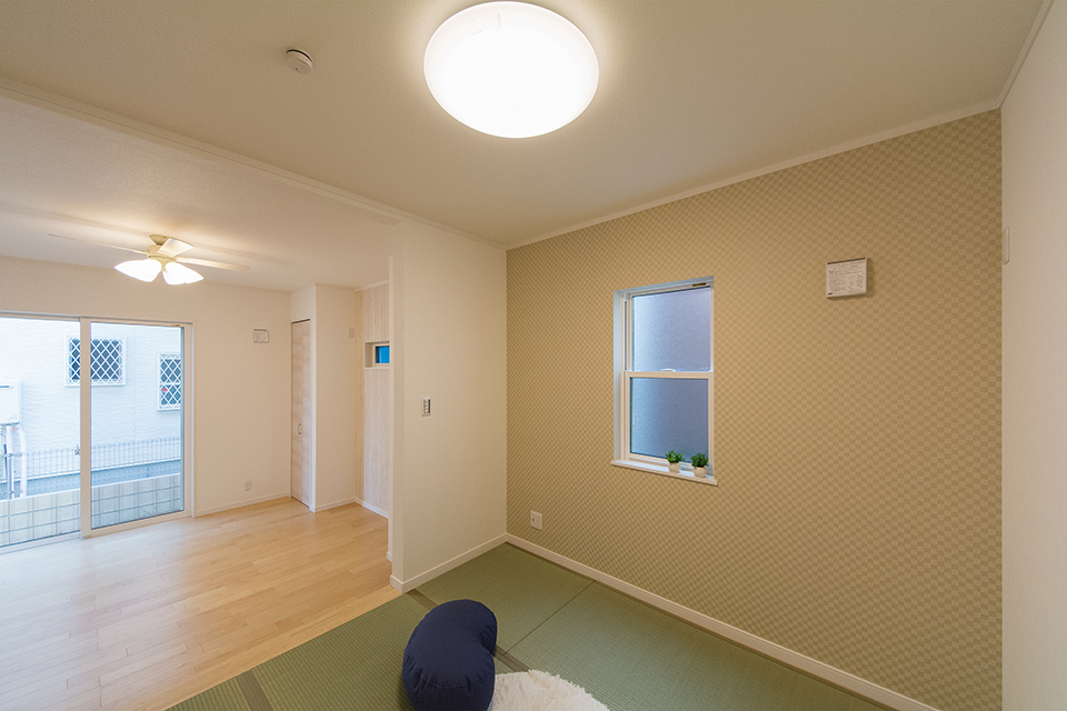 畳のさわやかなグリーンが空間を彩る小上がりになった畳敷きスペース。ブラウンのアクセントクロスが落ち着いた雰囲気を演出。
