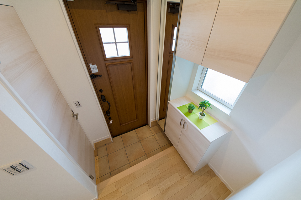 ベビーカーや傘立てなどが収納できる便利な土間収納を設えた玄関。