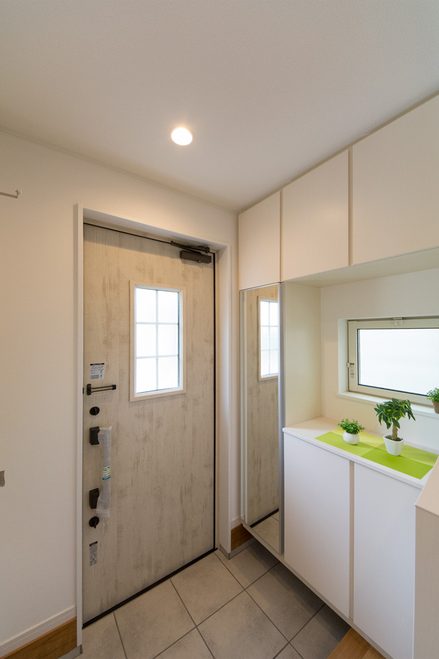 ナチュラルな雰囲気を演出するエクリュアイボリーの玄関ドアとグレーのテラコッタ調タイル。