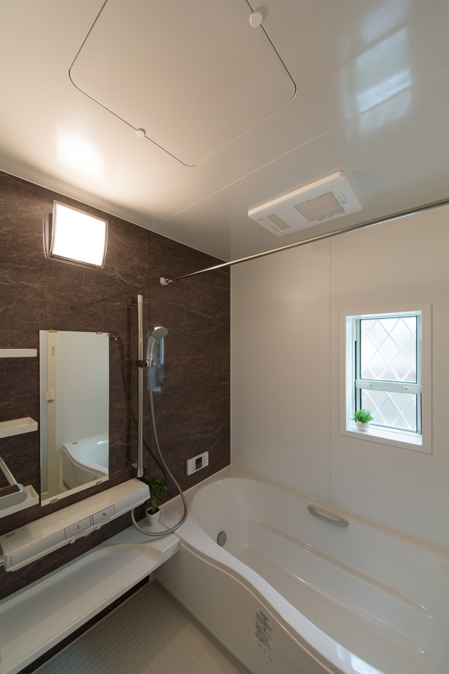 バスルーム。ナチュラルな配色のアクセントパネルを使用した、心地良い穏やかな空間。
