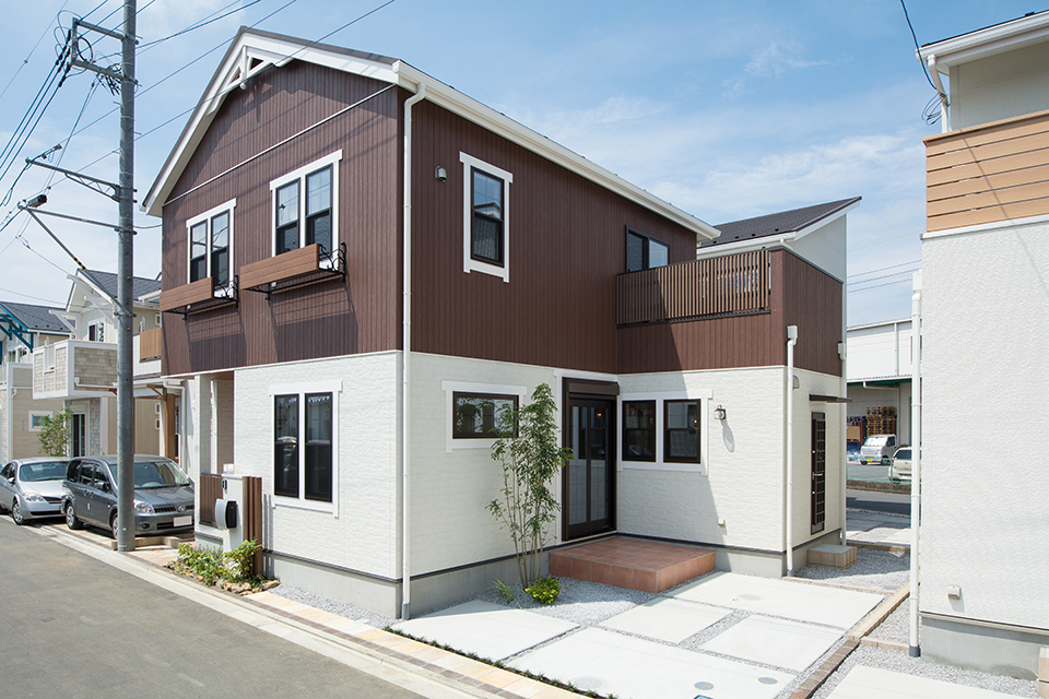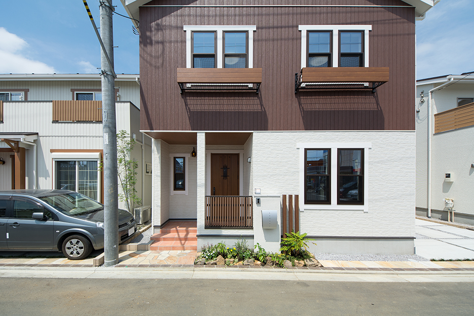 白とブラウンを上下で張り分けた外観デザイン。ナチュラルな雰囲気に仕上がりました。