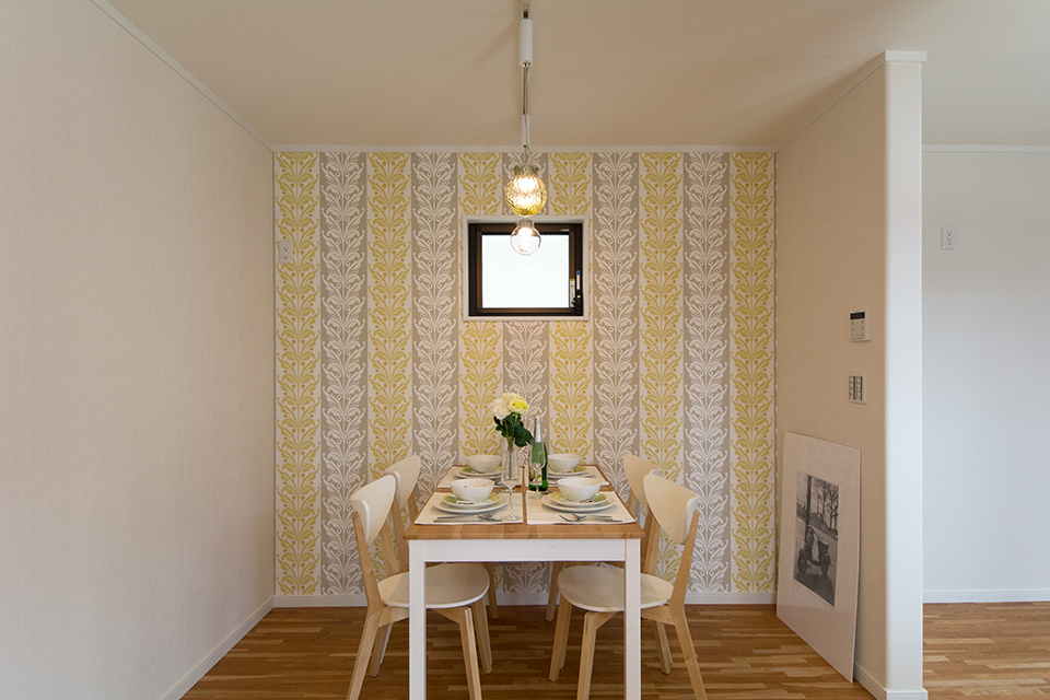 テキスタイルのアクセントクロスで、明るい雰囲気に包まれたダイニングスペース。