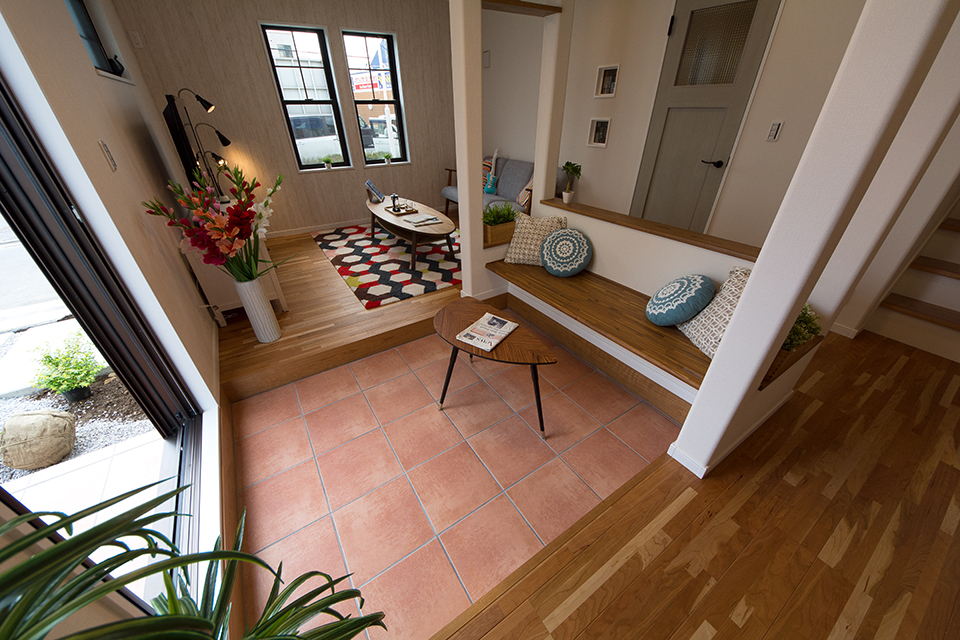 赤いテラコッタ調タイルがナチュラルな雰囲気を演出します。