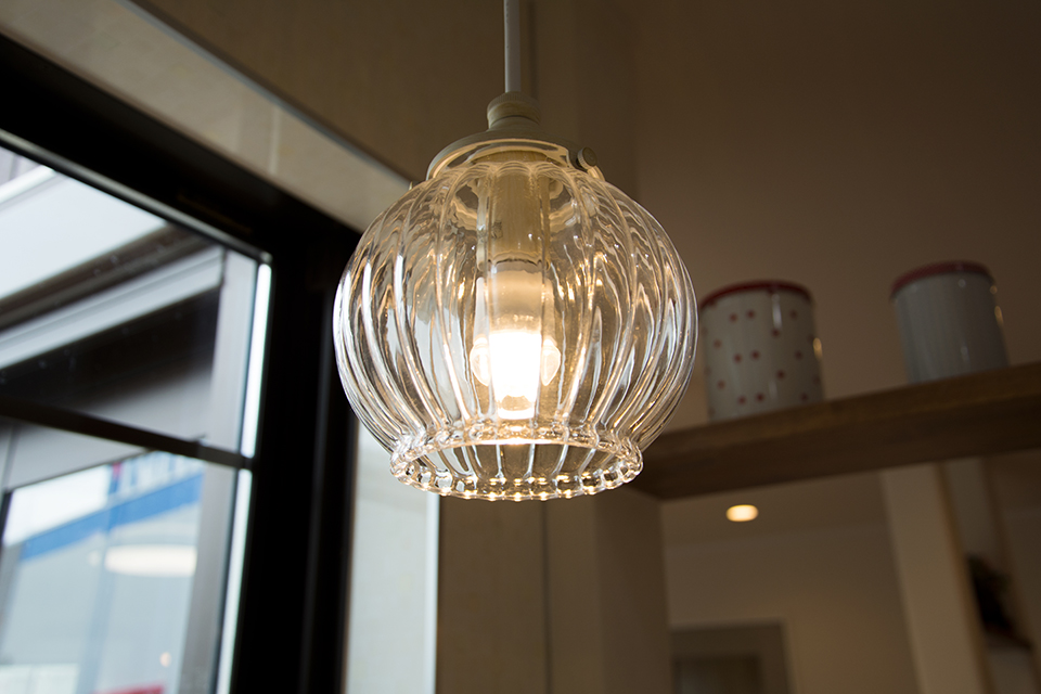 繊細なカッティングが美しいガラスシェードのペンダントライト。