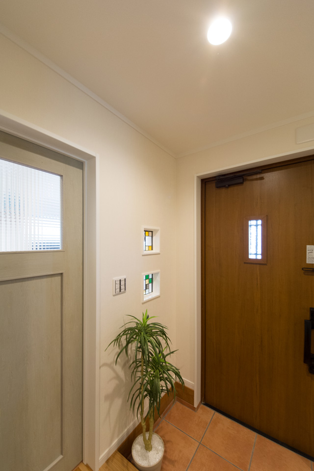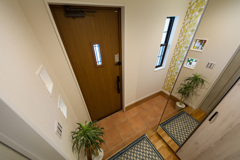 ベビーカーや傘立てなどが収納できる便利な土間収納を設えた玄関。