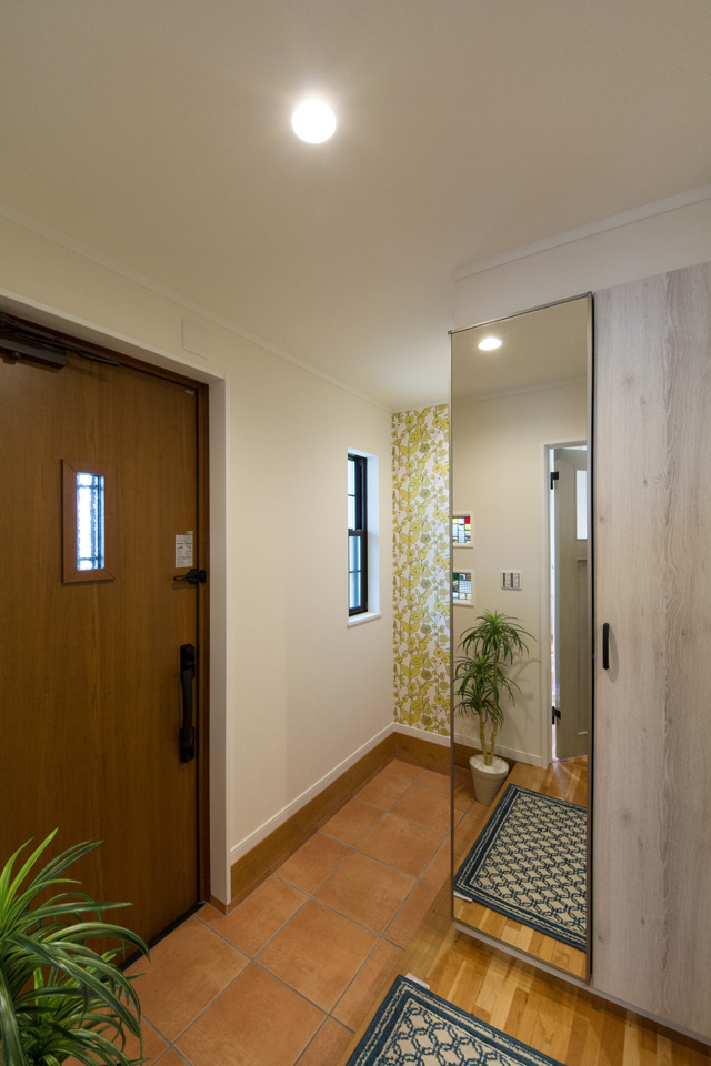 土間収納スペース。アクセントクロスが空間を彩ります。