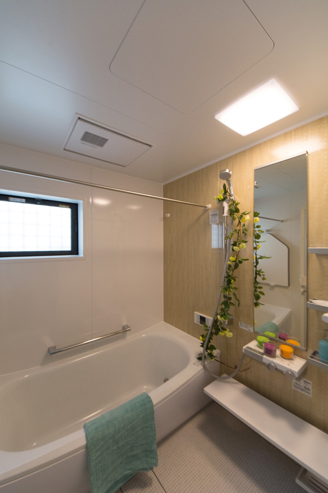 バスルーム。ナチュラルな配色のアクセントパネルを使用した、心地良い穏やかな空間。