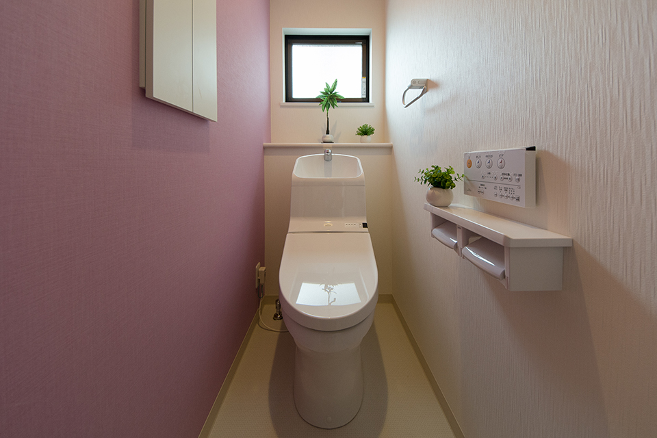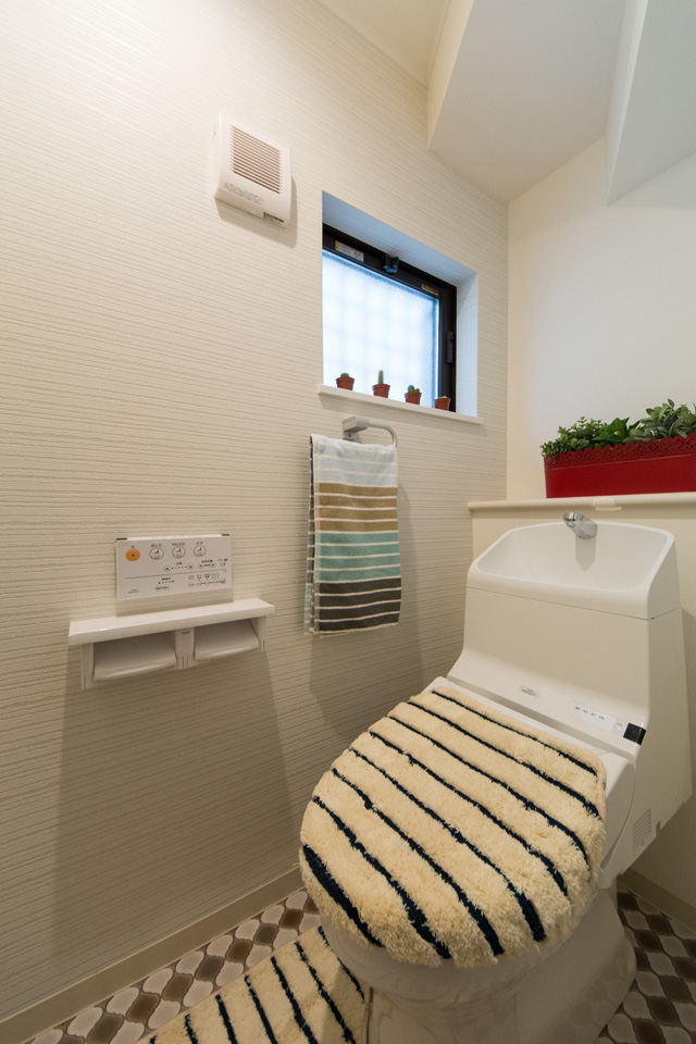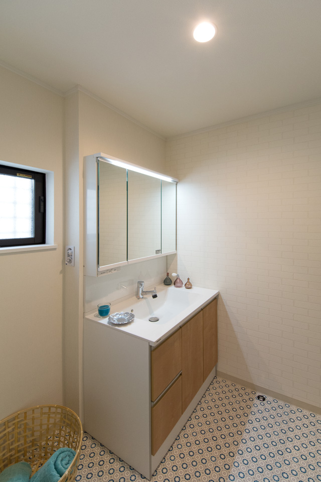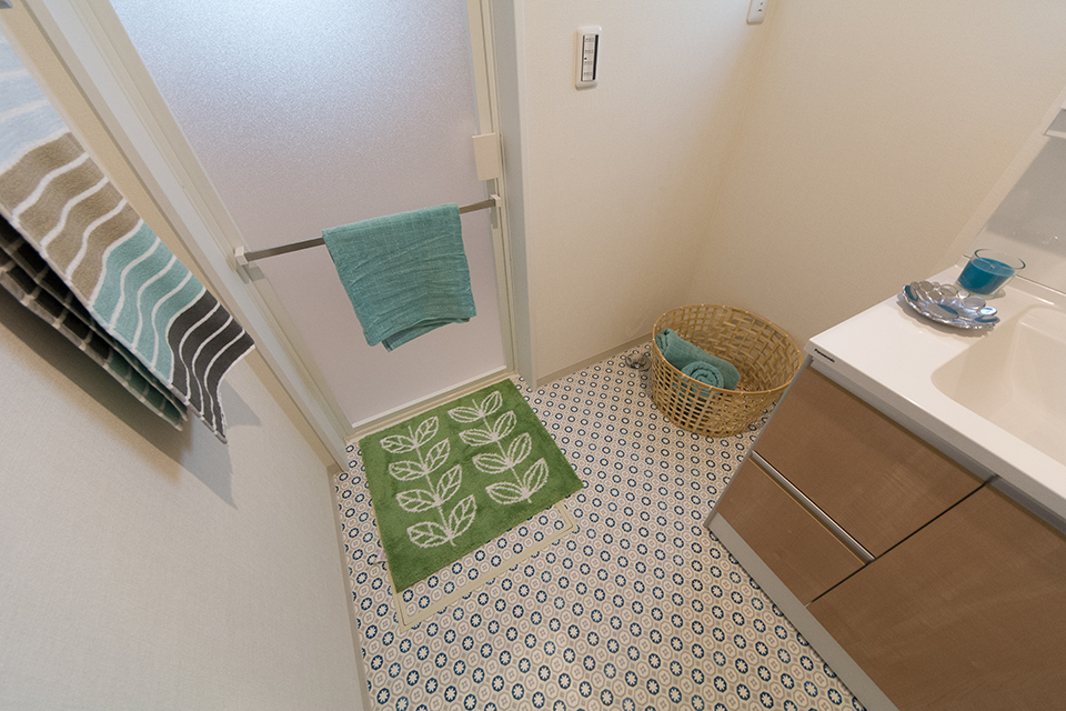 ノルディックデザインのクッションフロアがサニタリールームを彩ります。