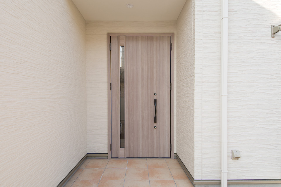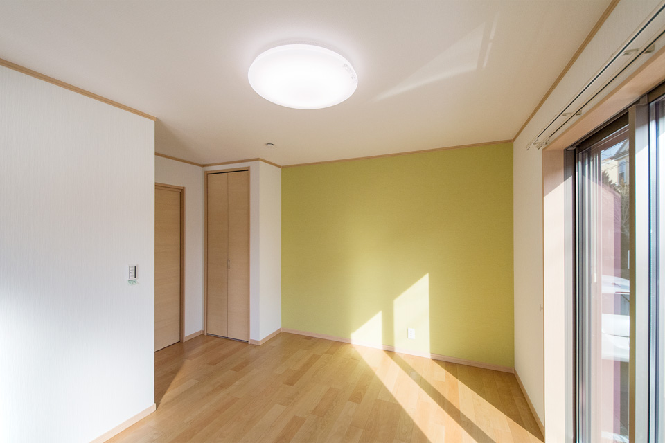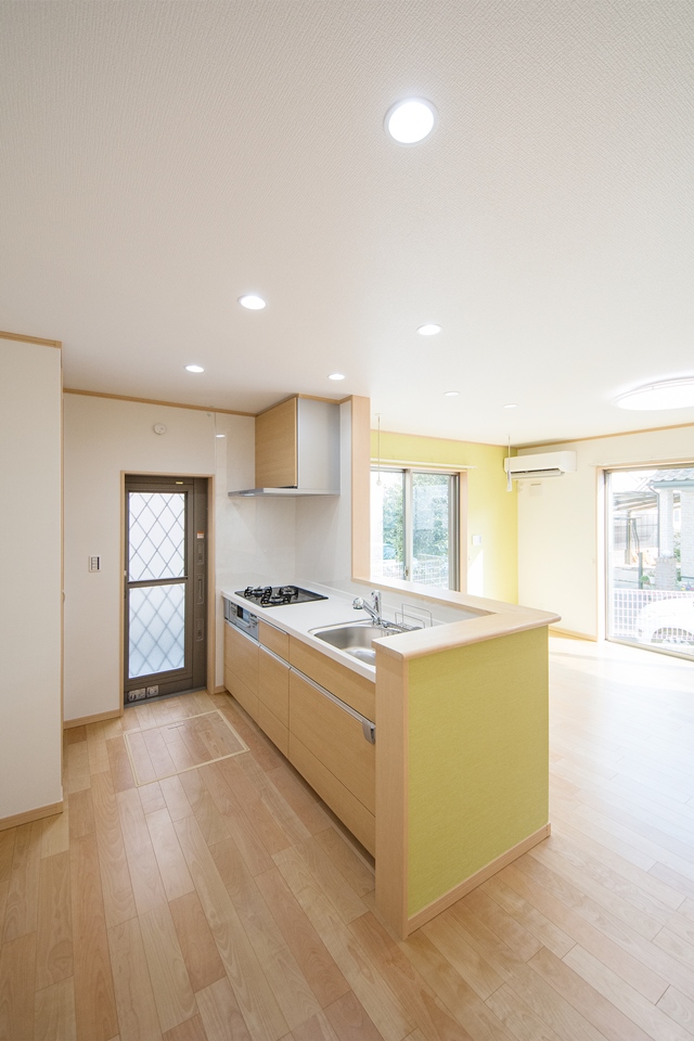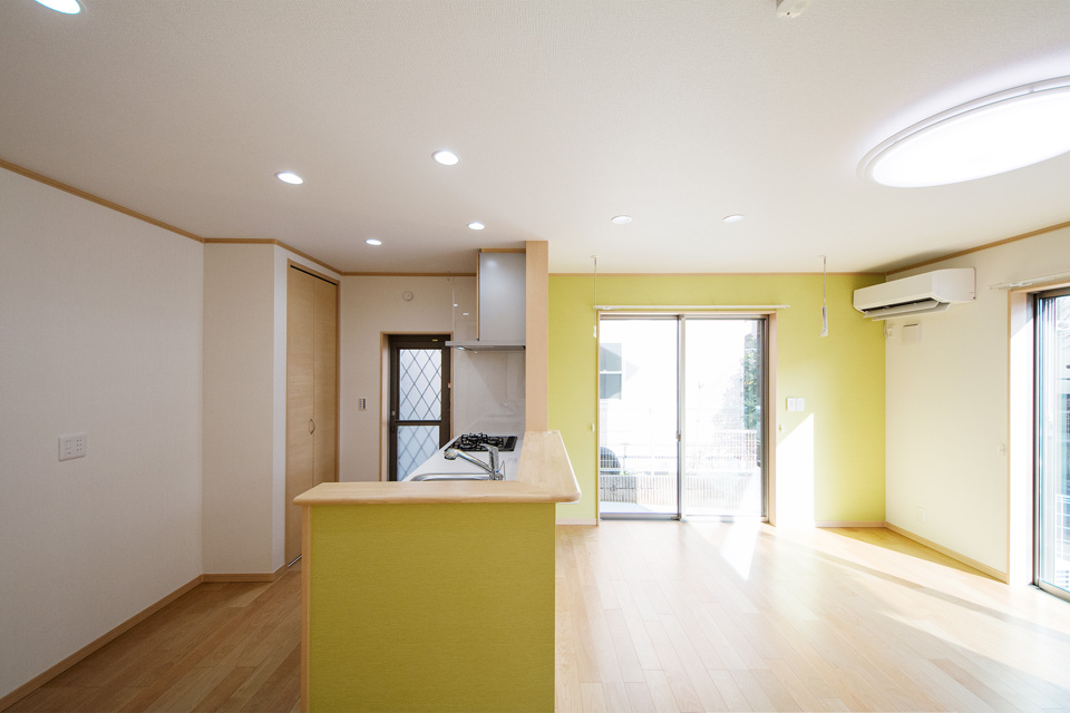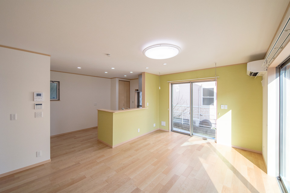 ご夫婦二人で快適なセカンドライフをお過しいただけるバリアフリーの平屋住宅。 シンプルで飽きのこない外観。 木々の緑を思わせるグリーンをアクセントカラーにした、さわやかな室内空間。