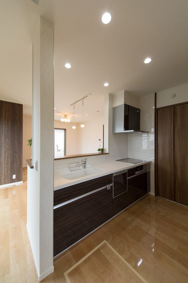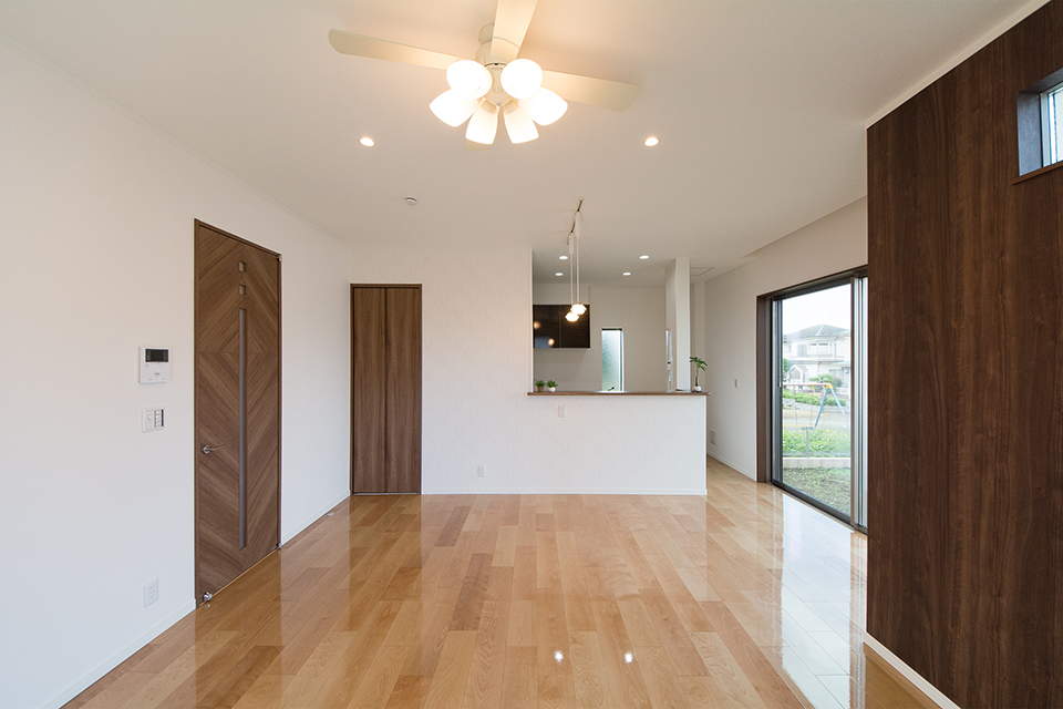 穏やかな木目と緻密な木肌が印象的なバーチのフローリングがブラウンの建具と相まって、ナチュラルな空間を演出。
