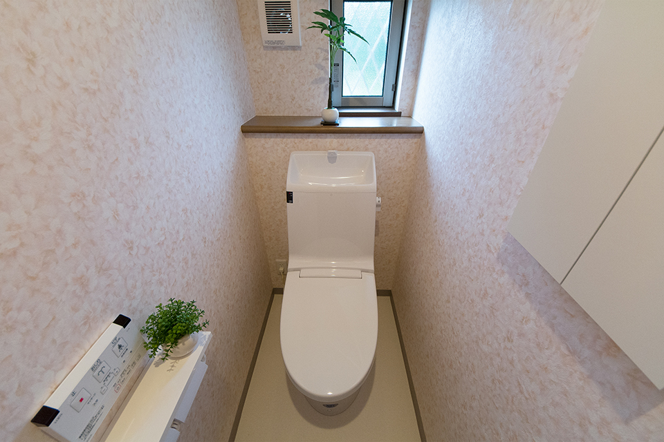 白を基調とした清潔感のある1階トイレ。ライトピンクの花柄のアクセントクロスがエレガントな印象をプラス。