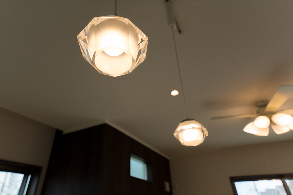 繊細なカッティングが美しいガラスシェードのペンダントライト。