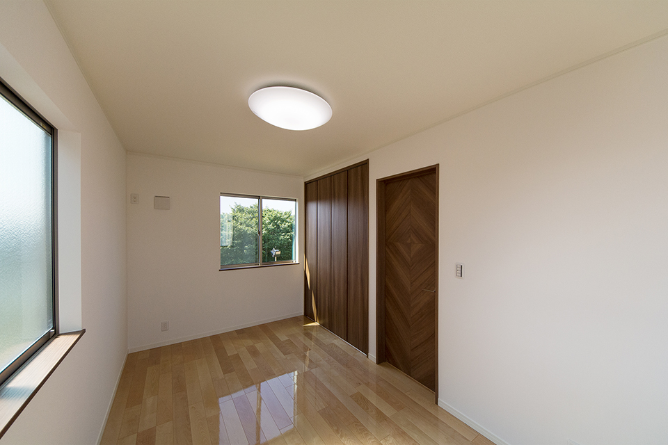 2階洋室。バーチのフローリングとブラウンの建具がナチュラルな空間を演出。