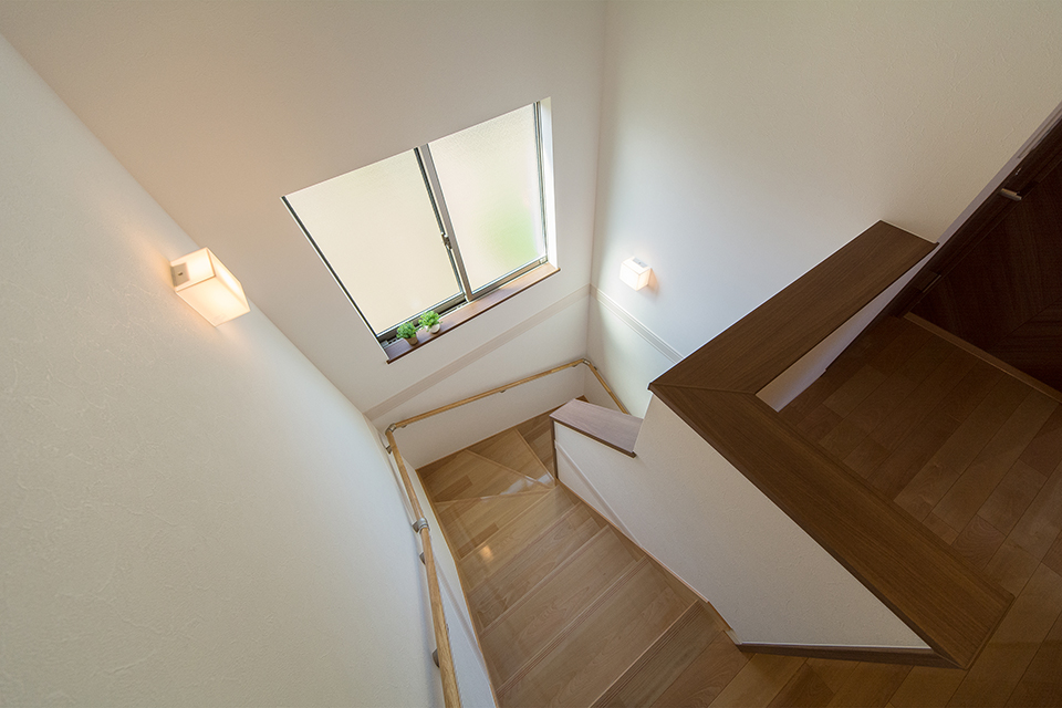 大きな窓をしつらえた、明るく開放感のある階段。