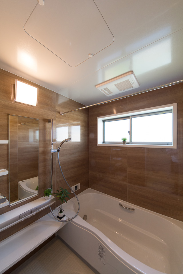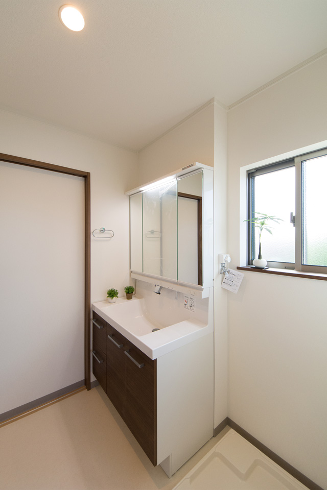 白を基調とした清潔感のあるサニタリールーム。ブラウンの洗面化粧台がナチュラルな雰囲気の空間を演出します。