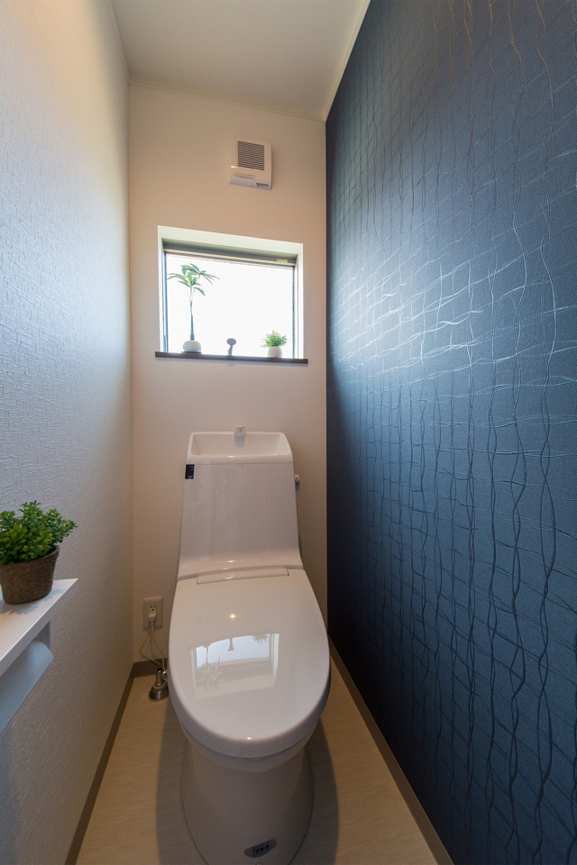 白を基調とした清潔感のある2階トイレ。紺色のアクセントクロスがシックで落ち着きのある空間を演出。