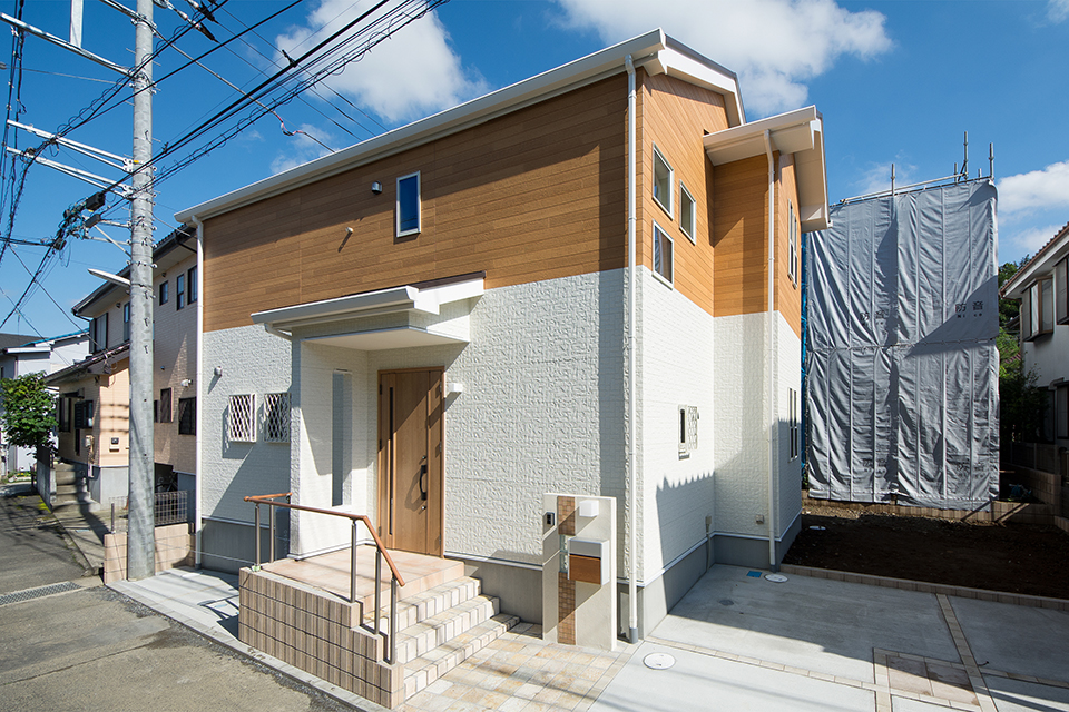 白の割り石柄サイディングを基調に、オレンジの木目調サイディングをアクセント。 温かみを感じるナチュラルなデザインに仕上がりました。
