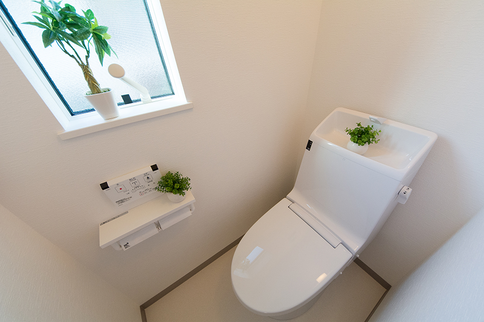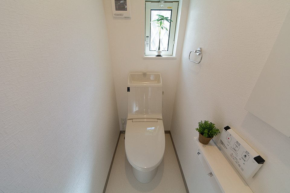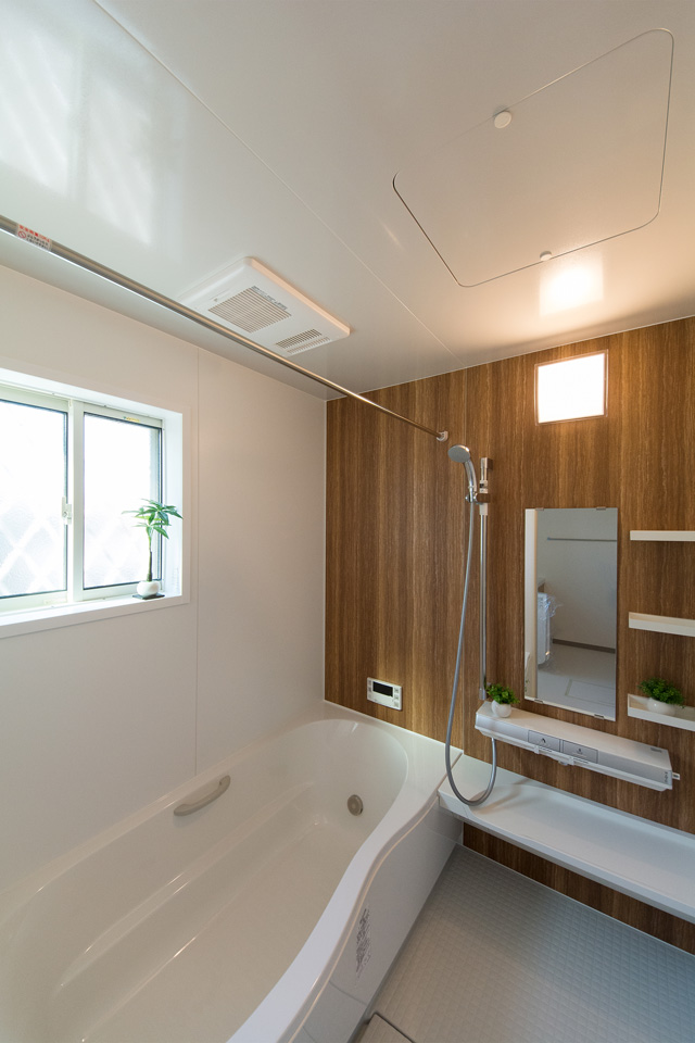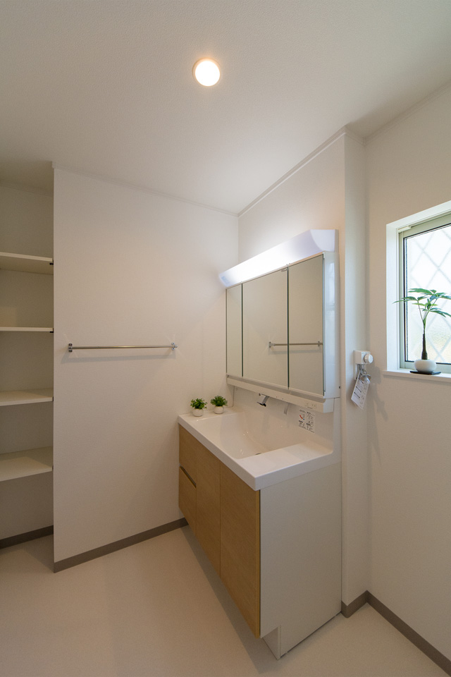 白を基調とした清潔感のあるサニタリールーム。ブラウンの洗面化粧台がナチュラルな印象を与えます。