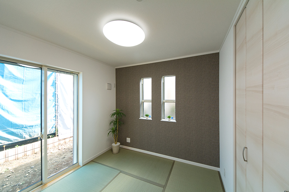 畳のさわやかなグリーンが空間を彩る1階畳敷きスペース。ブラウンのアクセントクロスが落ち着いた雰囲気を演出。